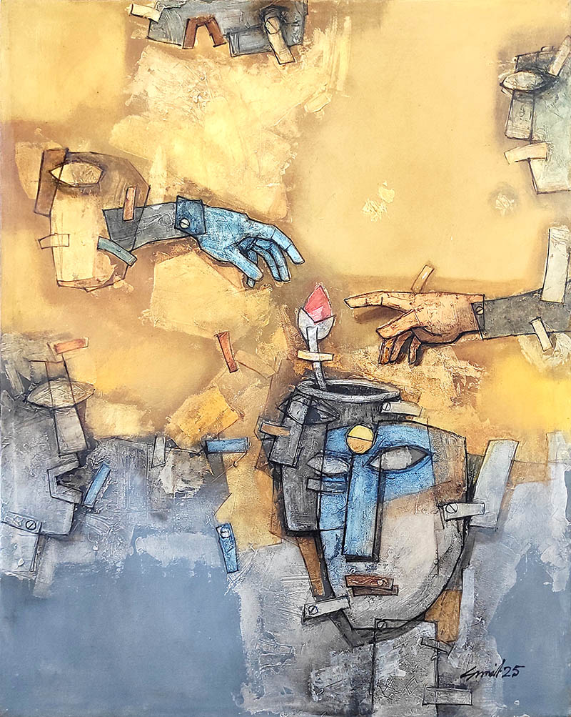 Machines have occupied a large part of our modern lifestyle. Although these machines help us in our daily life, on the contrary, they have caused various Incidents. Which is a big obstacle in our path of life. To express the expression of this mechanism and obstacle, various nuts and bolts, screws or screws have emerged in my paintings as symbols.