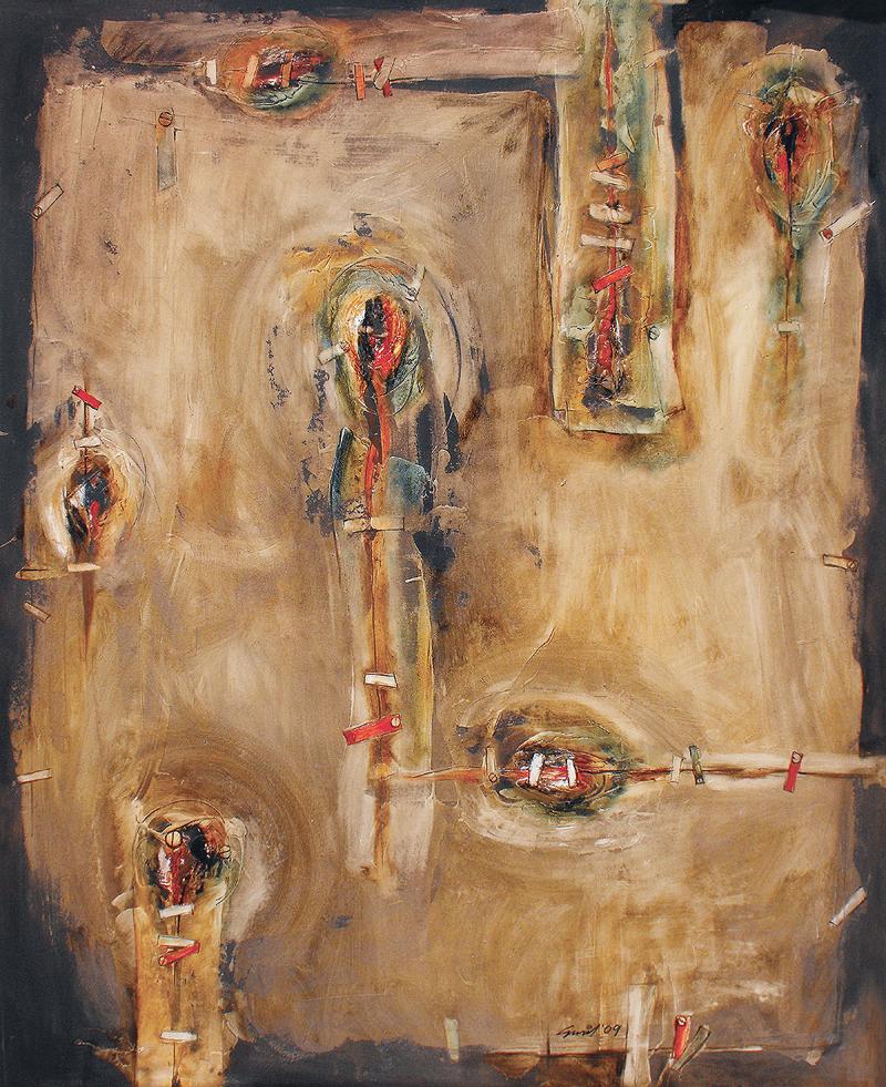 Machines have occupied a large part of our modern lifestyle. Although these machines help us in our daily life, on the contrary, they have caused various Incidents. Which is a big obstacle in our path of life. To express the expression of this mechanism and obstacle, various nuts and bolts, screws or screws have emerged in my paintings as symbols.